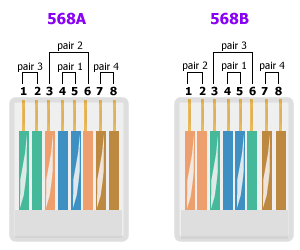 RJ-45 connector with the pins on the top and the tab on the bottom. In this position, Pin 8 is the rightmost and Pin 1 is the