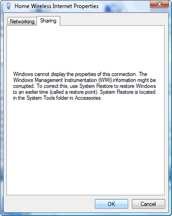 Picture: ICS error (Sharing tab doesn't work) due to the corrupted WMI information.